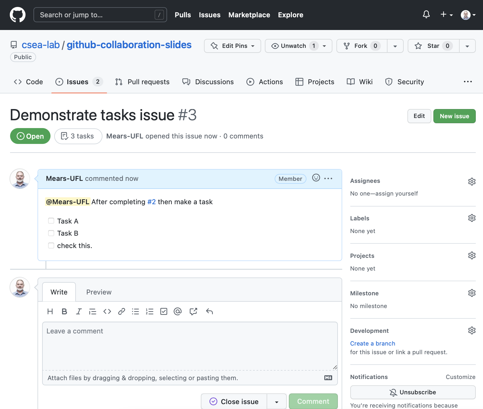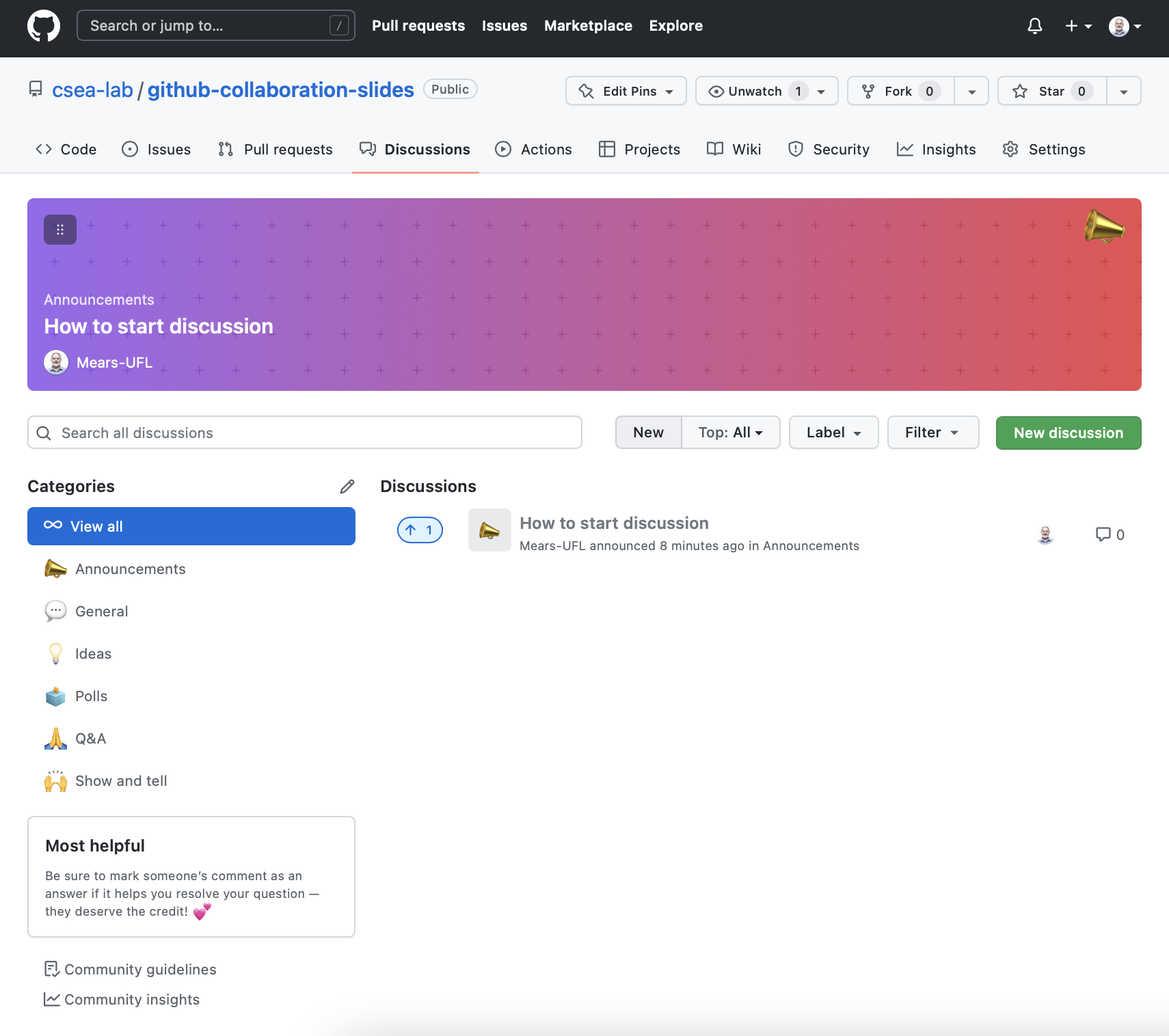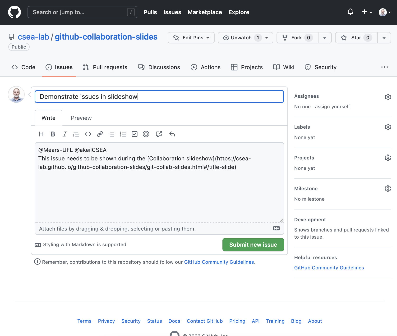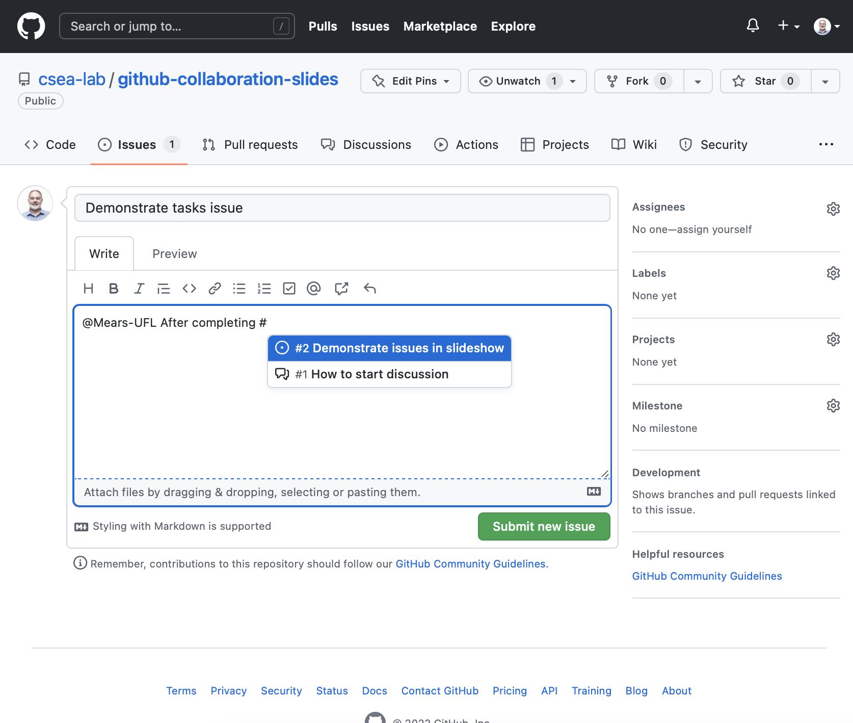 @ mention collaborators# followed by issue title, links related issues in repositoryUse GitHub Repository Discussions to: