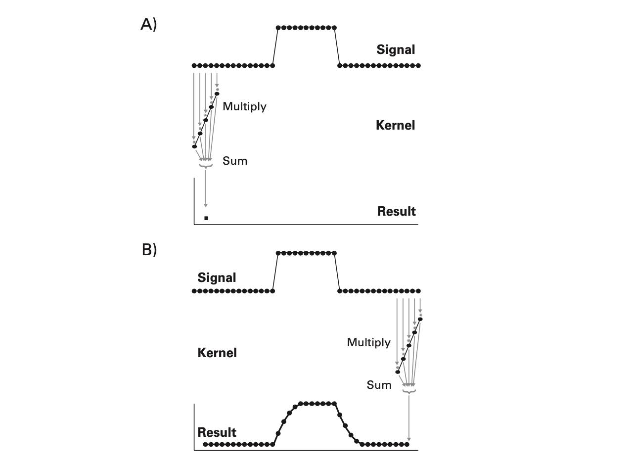 The math is simple. We take the kernel, move it to the first portion of the data by lining it up with the first sample point, then we multiply each element of the kernel with the data, sum the results into one new number and write that to that first sample point. This is the dot-product.