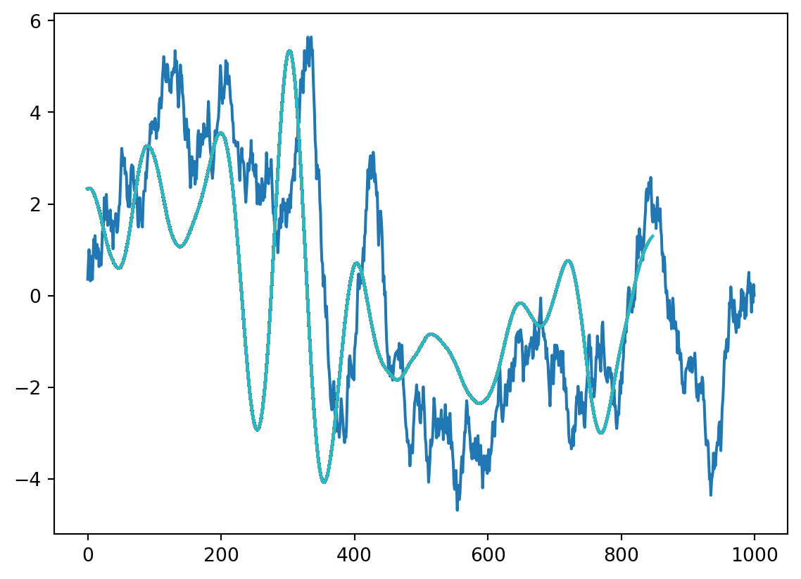 figure for x in np.arange(1, len(data1)-kernlength,1000//kernlength): convbyhand(x) = data1(x:x+kernlength-1)*kernel’; plot(data1), hold on plot([zeros(1,x) kernel], ‘g’, ‘LineWidth’,2),