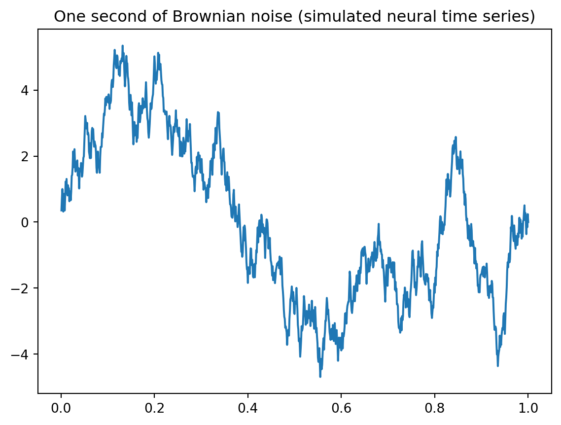 plt.title('One second of Brownian noise (simulated neural time series)')Text(0.5, 1.0, 'One second of Brownian noise (simulated neural time series)')