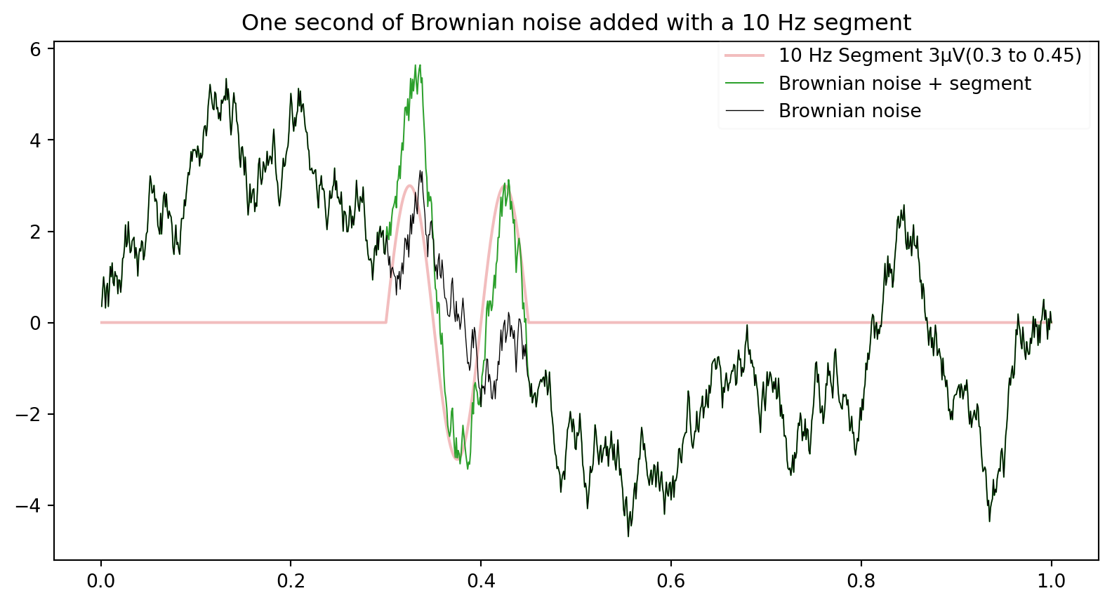 plt.title('One second of Brownian noise added with a 10 Hz segment')Text(0.5, 1.0, 'One second of Brownian noise added with a 10 Hz segment')